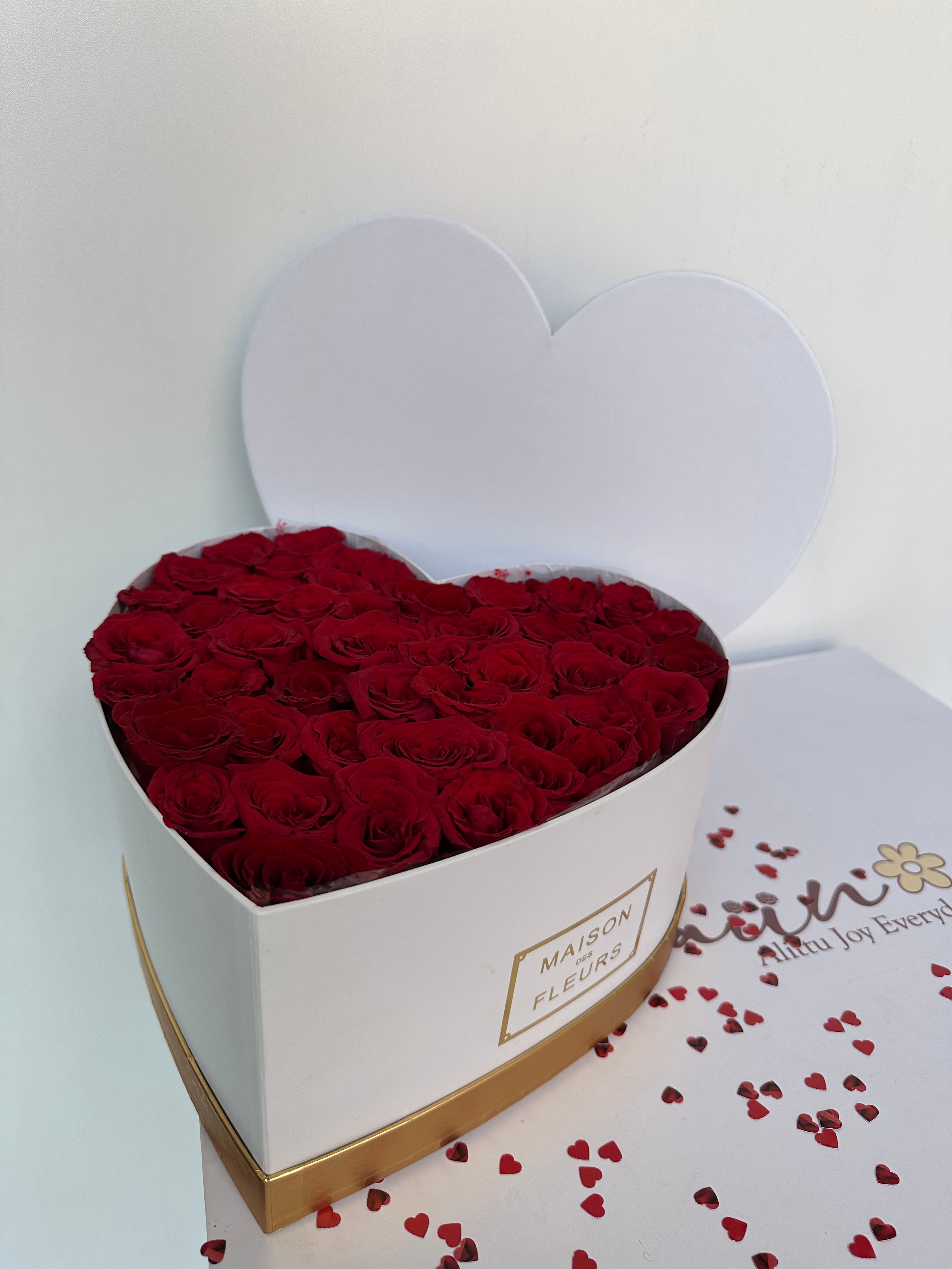 Heart-shaped box filled with fresh premium red roses