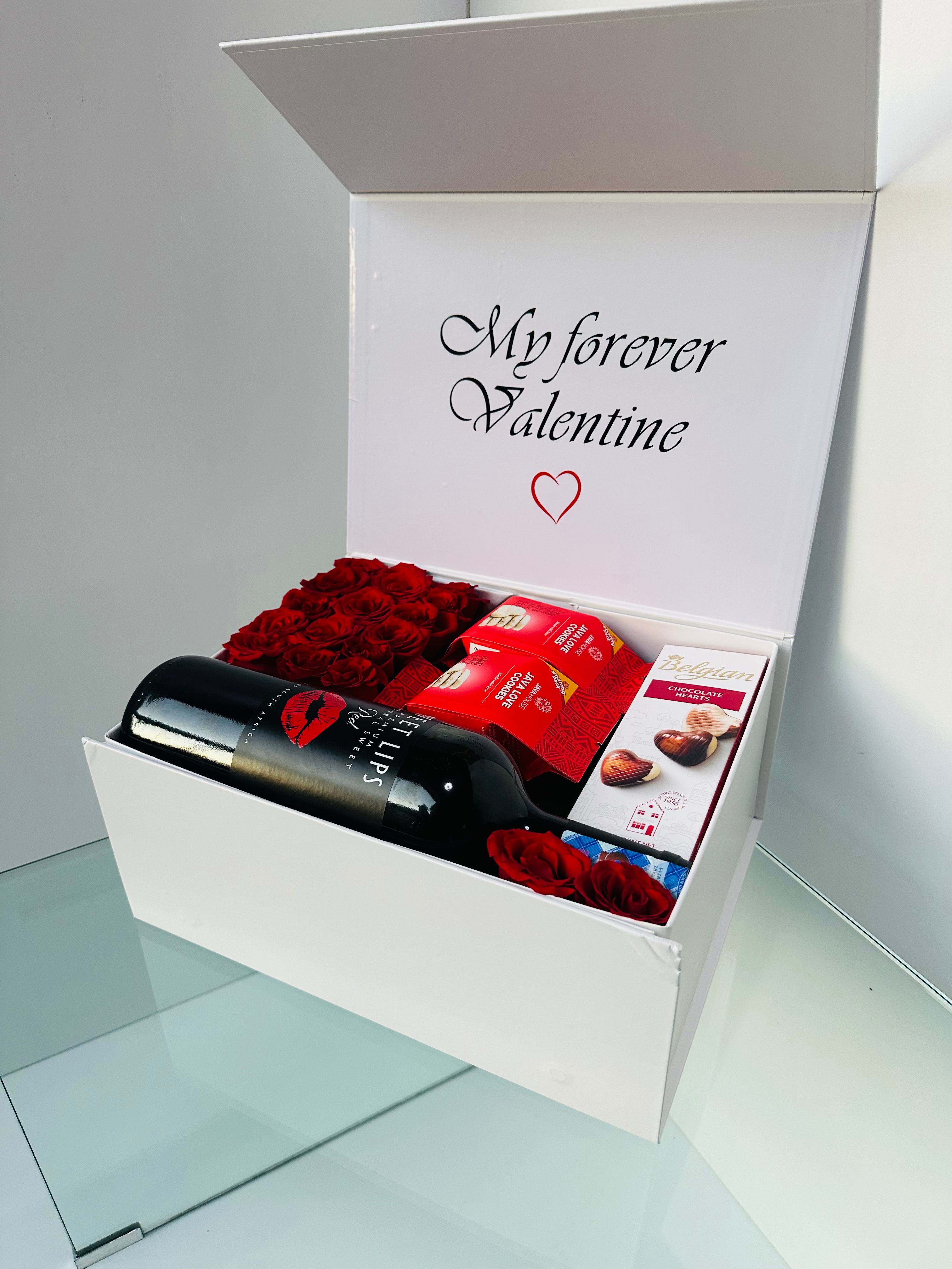 Make a grand romantic statement with our Forever Valentine Luxury Gift Box, a thoughtfully curated experience designed to celebrate love in its most elegant form. This premium keepsake box opens to reveal lush red roses, indulgent chocolates and a bottle of fine red wine, creating the perfect balance of romance and indulgence.