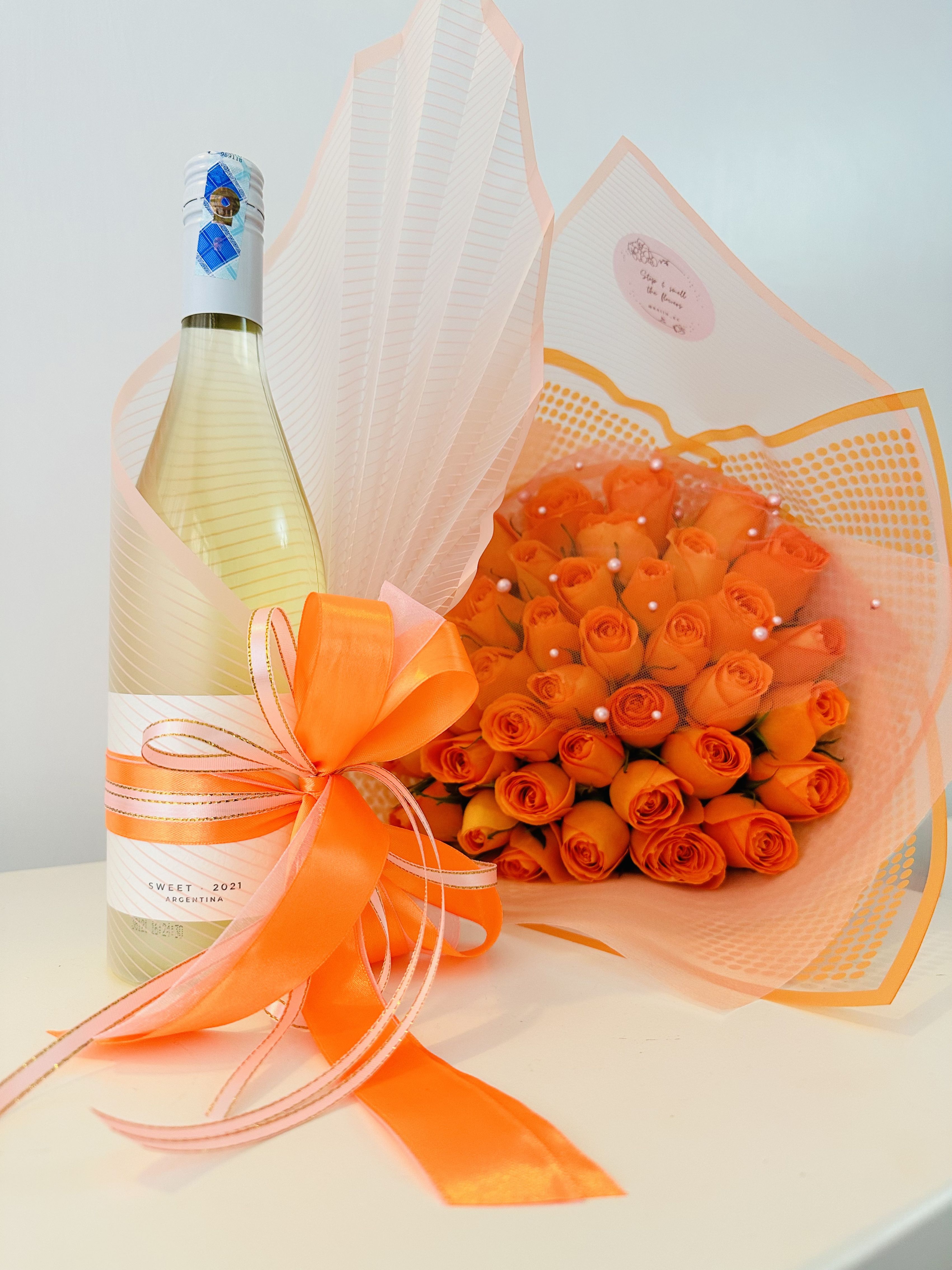 A bold expression of warmth and desire, this striking set features a lush bouquet of premium orange roses paired with a carefully selected bottle of high-quality wine and thoughtfully wrapped to perfection in Raiin’s signature style.